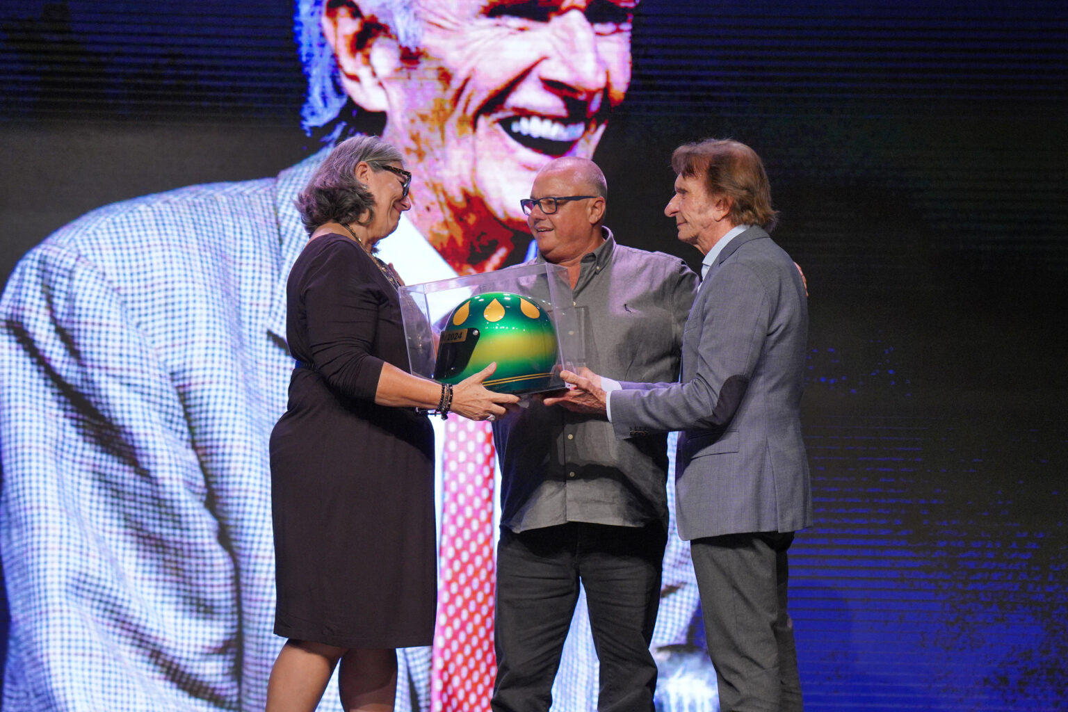 Rita Fittipaldi, esposa de Wilson Fittipaldi Jr., recebe de Alan Mosca (Sid Special Painting) e de Emerson Fittipaldi o Capacete de Ouro Especial