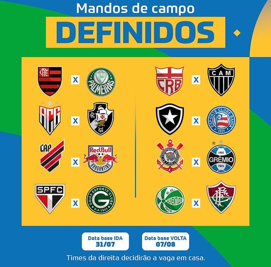 Já o CRB de Alagoas, que enfrentará o bicampeão Atlético-MG, tentará chegar pela primeira vez às quartas de final. O time nordestino avançou às oitavas após duas vitórias (ida e volta) por 1 a 0 sobre o Ceará.