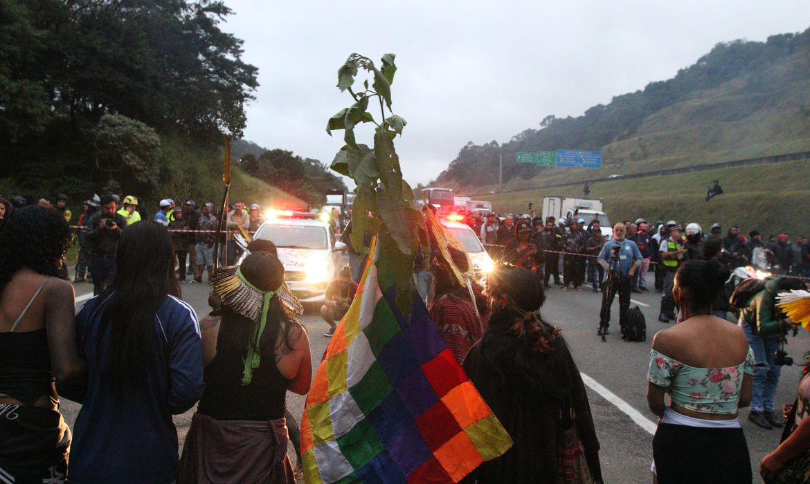 Na manhã de hoje (30), indígenas guarani, que vivem no Pico do Jaraguá, em São Paulo, bloqueiam a Rodovia dos Bandeirantes, na altura do km 20, no sentido São Paulo, para protestar. (Agência Brasil)
