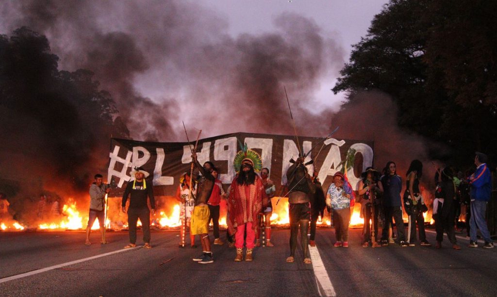 Os Guaranis da Terra Indígena Jaraguá, em São Paulo, bloqueiam neste momento a Rodovia dos Bandeirantes, no sentido São Paulo, contra a votação do PL 490/2007, que pretende estabelecer um marco temporal para a demarcação de terras indígenas.