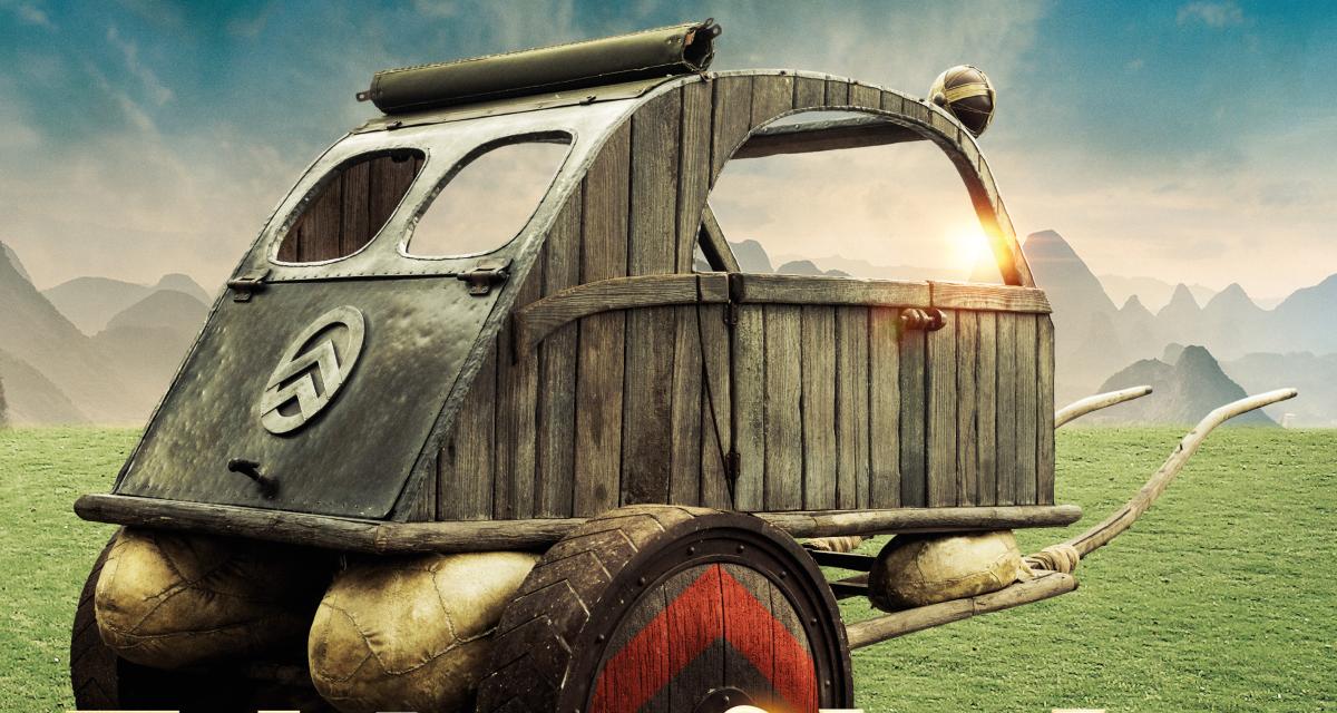 Mais adiante, quando o exército de César chega à China, há um cartaz publicitário na entrada do país promovendo o melhor carro da época: o 2CV, uma incrível carruagem feita na Gália, puxada por dois cavalos. A cena faz alusão a um famoso filme publicitário Citroën feito na Grande Muralha da China.