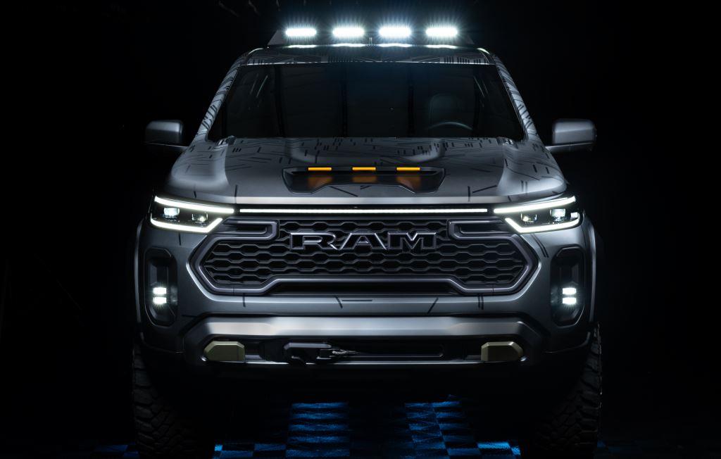 A nova Dakota será fabricada na Argentina e atenderá toda a América Latina. Logo na dianteira se destaca a grade do radiador, com o nome Ram vazado e grafado na parte central, emoldurado por uma linha de led que cruza a dianteira da picape entre as laterais e indo até os faróis, também de leds.