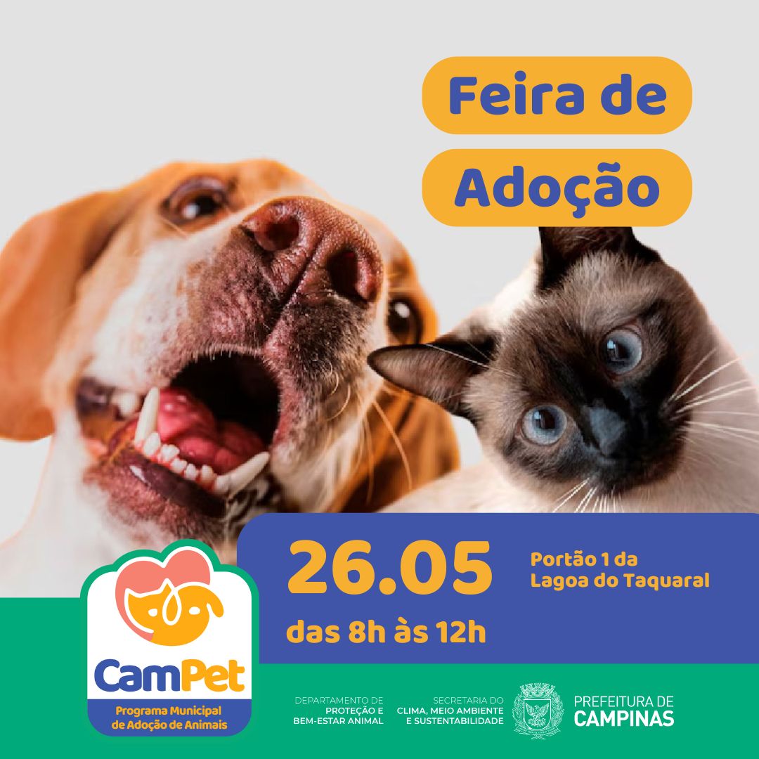 No próximo domingo o DPBEA – Departamento de Proteção e Bem-Estar Animal vai realizar, das 8h às 12h, no Portão 1 da Lagoa do Taquaral, a CamPet – 1ª Feira de Adoção de Animais. Quem estiver por lá com seu pet, também poderá fazer a microchipagem gratuita do animal.