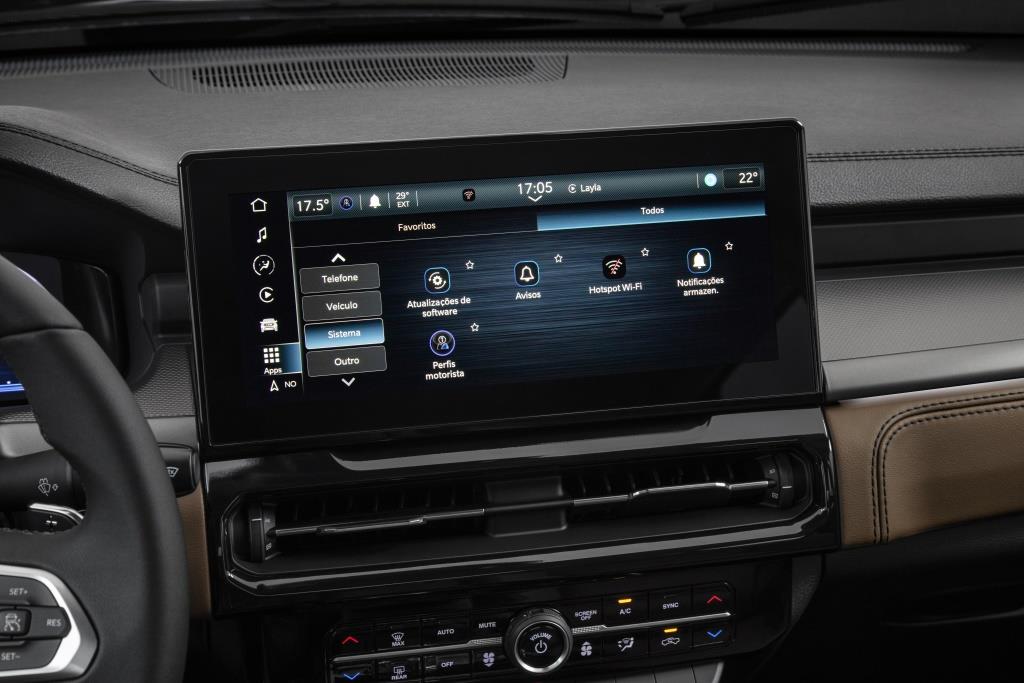 Falando em carregamento, 6 portas USB – sendo 3 do tipo C – estão espalhadas pela cabine, a maior quantidade entre as picapes compactas e médias oferecidas no mercado. Vale lembrar que duas dessas estão posicionadas em um porta-objetos localizado abaixo do console central.