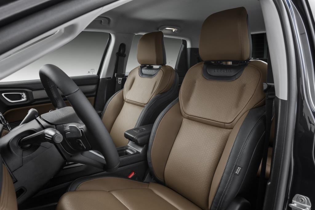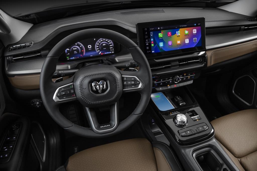 O painel de instrumentos é revestido em couro, assim como o painel de portas, o apoio de braço central e o volante multifuncional com ajuste de altura e profundidade. O revestimento do painel de instrumentos é revestido em couro preto na versão Rebel, couro marrom na Laramie e suede na R/T.