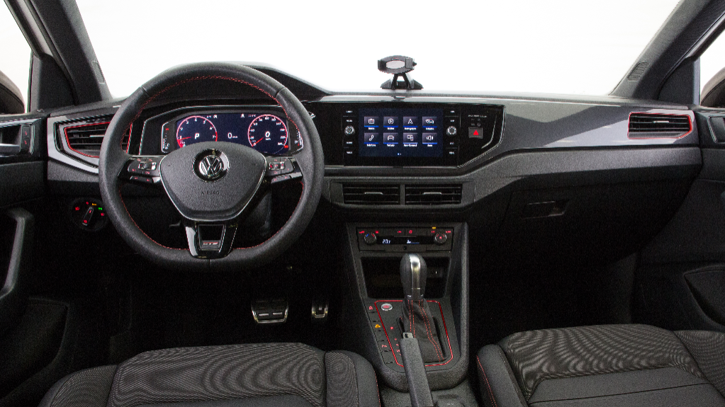 O interior será quase igual ao Polo/Virtus GTS, com detalhes em vermelho e acabamento em cinza e vermelho.